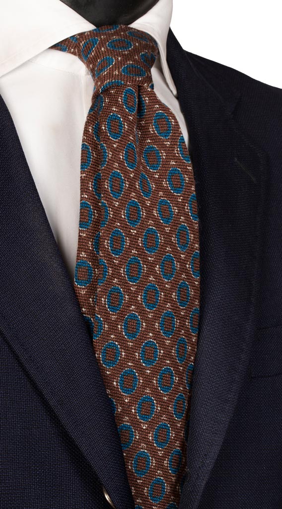 Man Brown Wool Silk Tie Deep Blue White Pattern L774