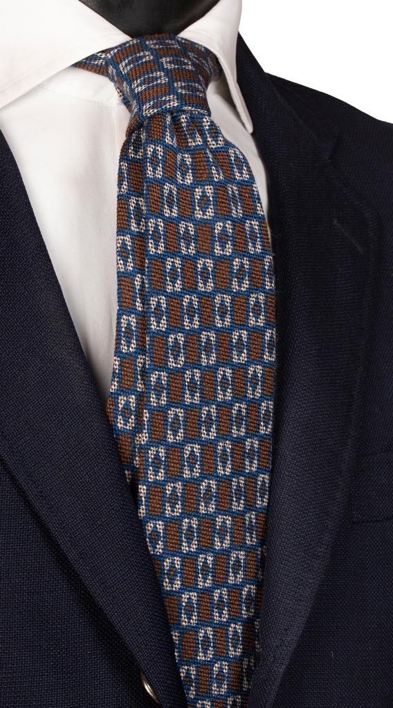 Man Brown Wool Silk Tie Deep Blue Beige Pattern L801