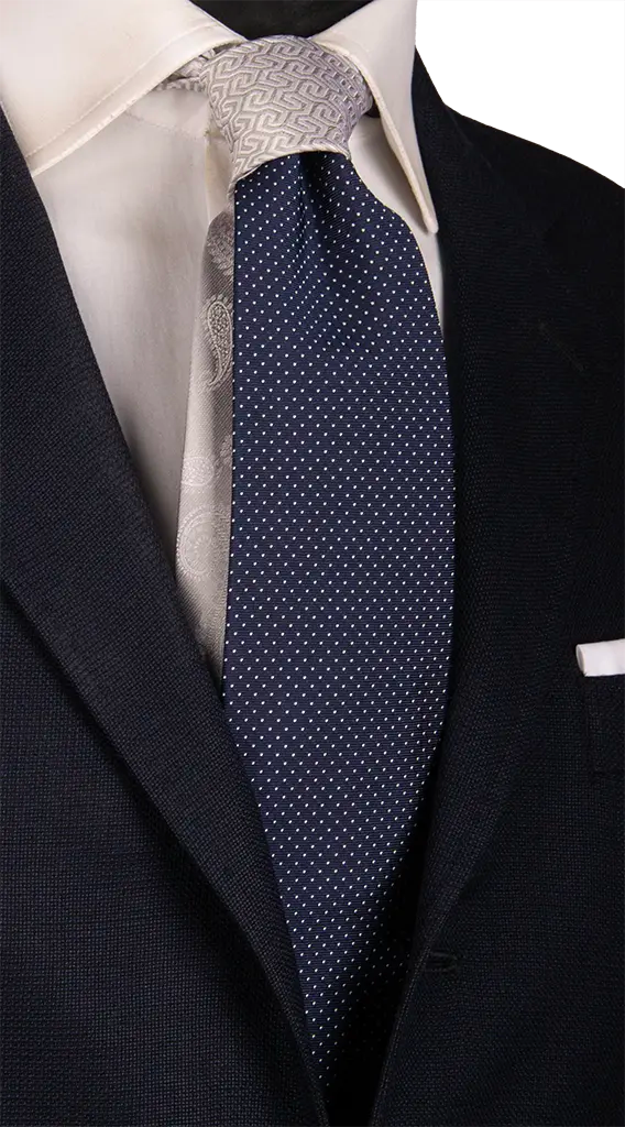Cravatta Cerimonia Blu Pois Grigio Argento Nodo in Contrasto Grigio Argento N3049