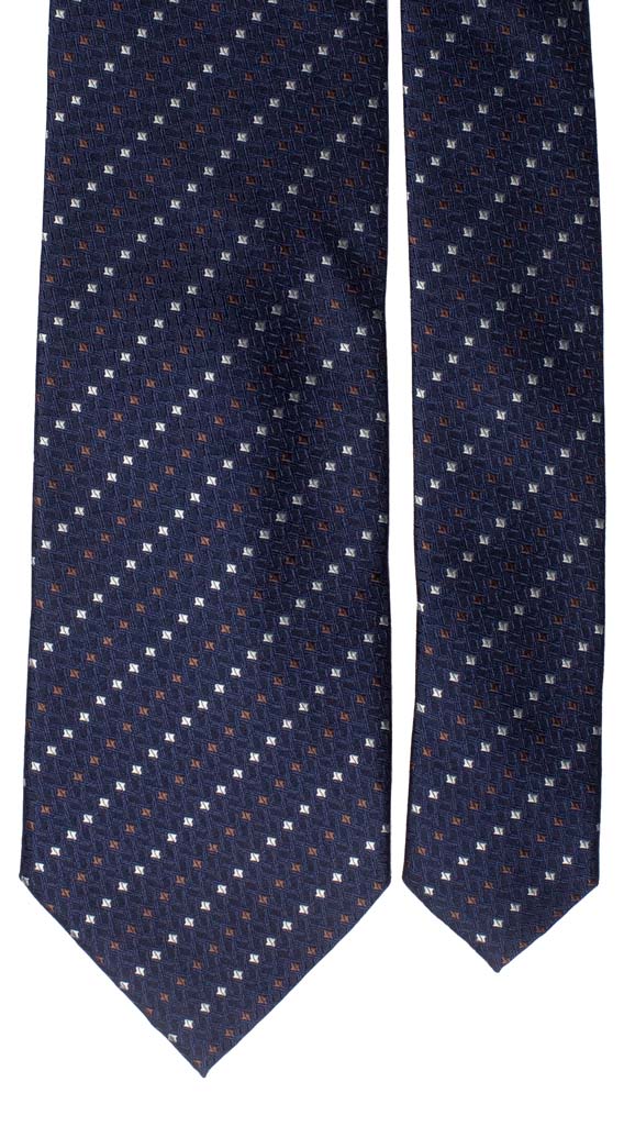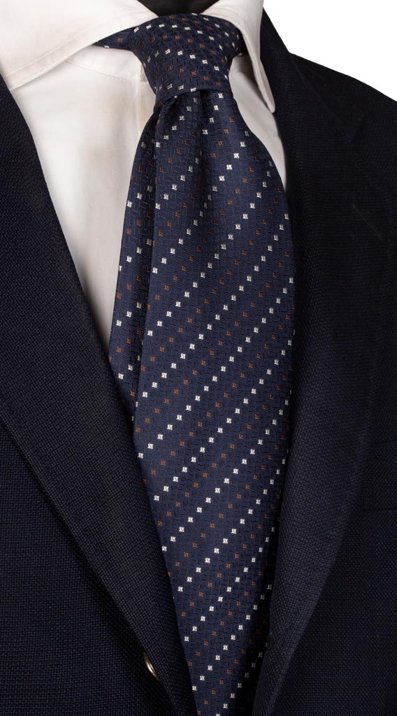 Cravatta di Seta Blu Fantasia Marrone Bianco 1408