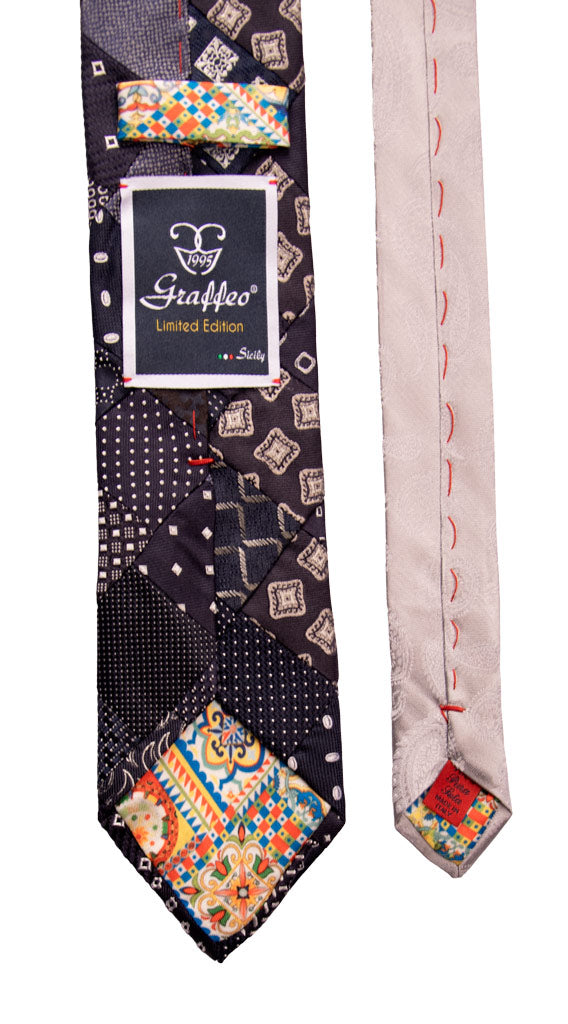 La cravatta Micro Mosaico nasce dalla composizione esclusiva di circa 250 ritagli di pregiati tessuti in seta italiana che vengono accuratamente tagliati e cuciti uno ad uno.
