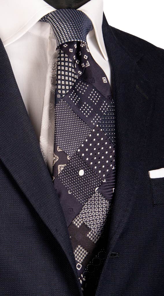 Cravatta Micro Mosaico Patchwork di Seta Blu Fantasia Grigio Argento PM599