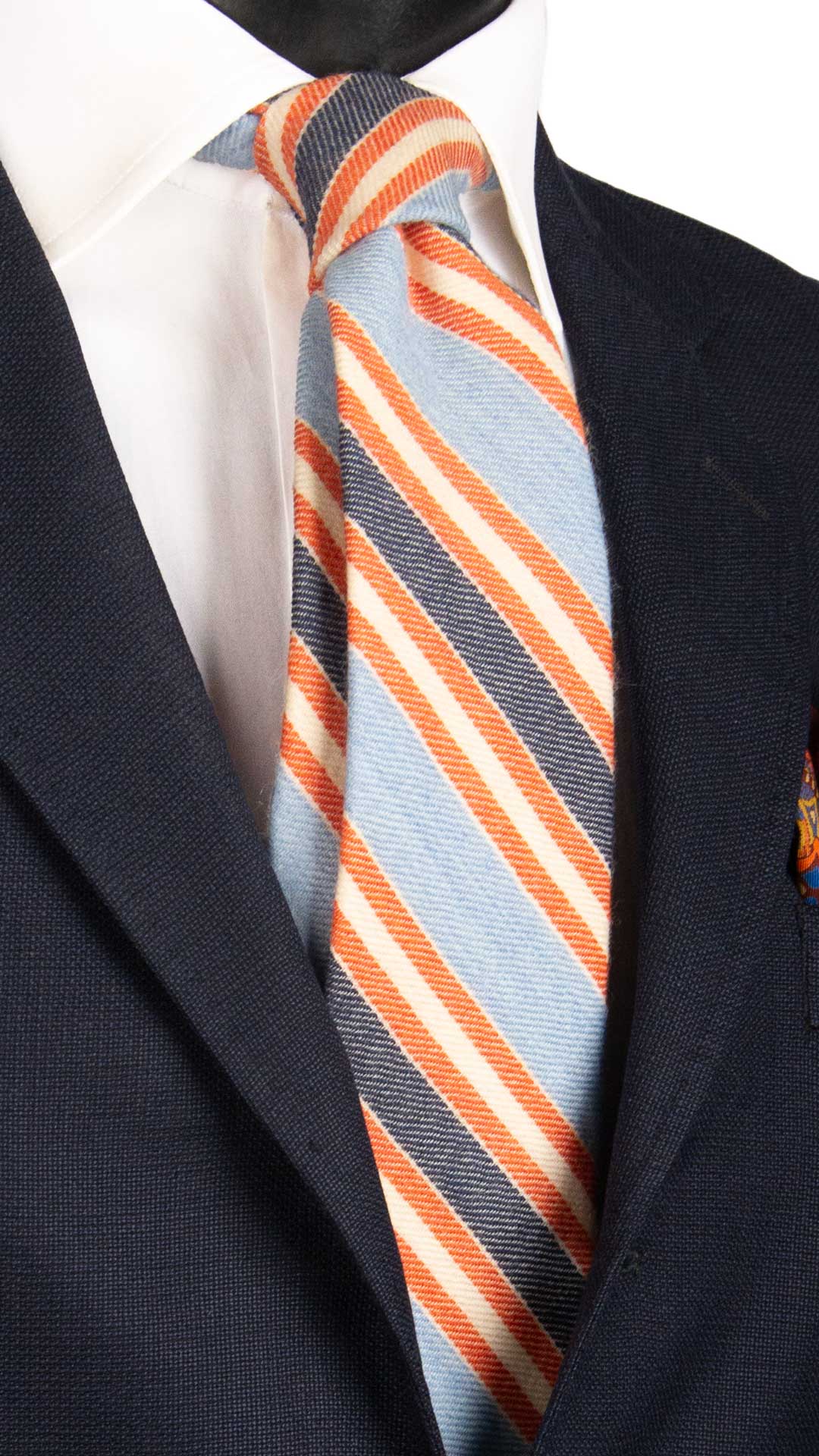 Cravatta Regimental in Lana Cashmere con Righe Celesti Blu Arancione Bianco Panna L975