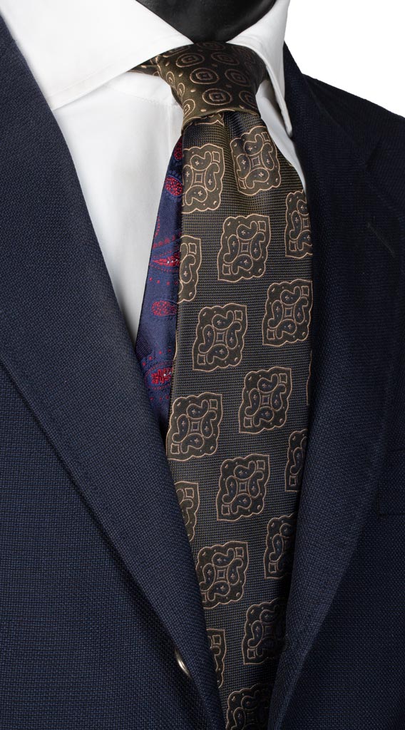 Cravatta Verde Oliva con Medaglioni Beige Nodo in Contrasto Verde N2216